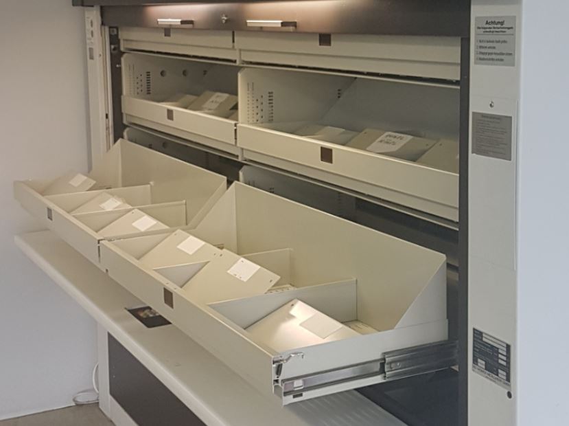 14 Fachböden mit jeweils 2 Schubladen pro Schublade 2 feste Unterteilungen